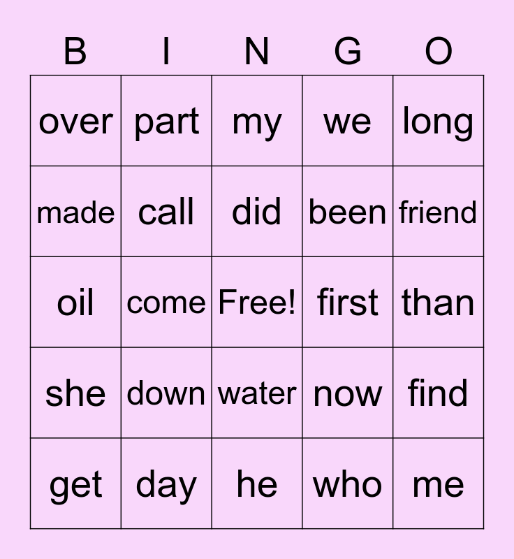 This bingo card has a free space and 24 words: down, day, did, get, long, over, made, part, first, water, been, oil, now, find, call, who, than, my, friend, come, me, she, we and he.