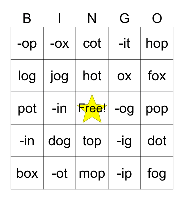 This bingo card has a free space and 24 words: dog, -ot, hot, box, hop, -op, log, -ox, -og, top, ox, pot, -ig, dot, jog, -ip, pop, cot, fox, -in, fog, -in, -it and mop.