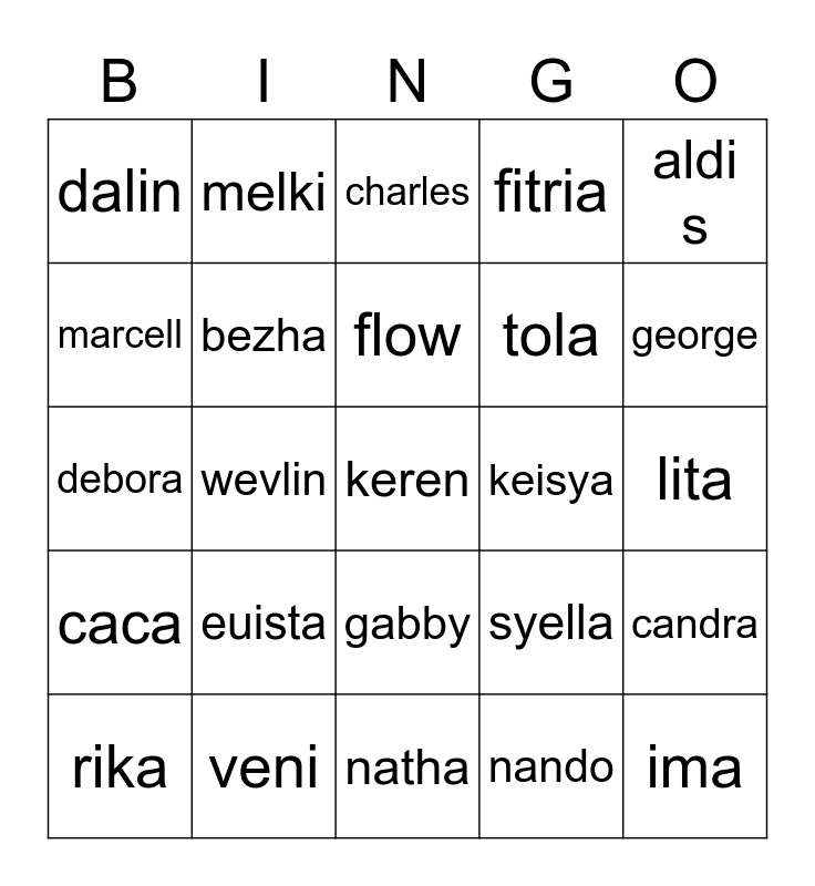 This bingo card has 25 words: euista, natha, flow, rika, aldi s, dalin, marcell, melki, keisya, gabby, tola, debora, syella, candra, bezha, ima, lita, charles, george, wevlin, keren, veni, caca, fitria and nando.