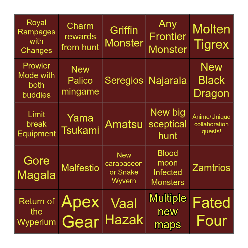 This bingo card has a free space and 24 words: Malfestio, Apex Gear, Seregios, Return of the Wyperium, Molten Tigrex, Royal Rampages with Changes, Prowler Mode with both buddies, Charm rewards from hunt, New big sceptical hunt, New carapaceon or Snake Wyvern, Najarala, Limit break Equipment, Blood moon Infected Monsters, Zamtrios, New Palico mingame, Multiple new maps, Anime/Unique collaboration quests!, Griffin Monster, New Black Dragon, Yama Tsukami, Fated Four, Gore Magala, Any Frontier Monster and Vaal Hazak.