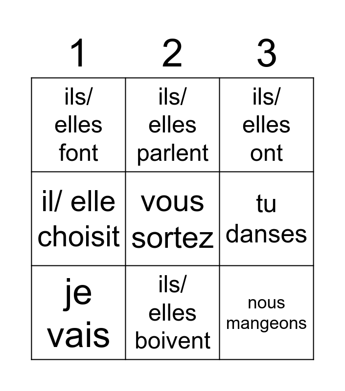 This bingo card has 9 words: je vais, ils/ elles ont, ils/ elles parlent, il/ elle choisit, ils/ elles font, tu danses, vous sortez, nous mangeons and ils/ elles boivent.