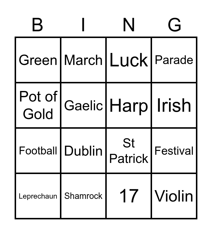 This bingo card has 20 words: Festival, Ireland, Luck, Rainbow, Leprechaun, Pot of Gold, Shamrock, Green, Football, March, Dublin, St Patrick, Gaelic, Violin, Harp, Music, Irish, Parade, 17 and Story.