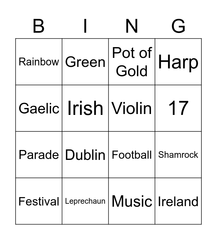 This bingo card has 20 words: Shamrock, St Patrick, Pot of Gold, Story, Festival, Gaelic, Leprechaun, Rainbow, Parade, Green, Dublin, Football, Irish, Ireland, Violin, March, 17, Harp, Music and Luck.
