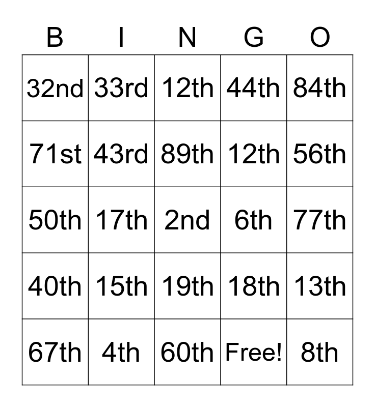 This bingo card has 30 words: 4th, 91st, 17th, 11th, 32nd, 12th, 43rd, 19th, 6th, 60th, 77th, 2nd, Free!, 8th, 56th, 65th, 18th, 40th, 15th, 84th, 50th, 48th, 33rd, 12th, 71st, 44th, 13th, 67th, 89th and 25th.