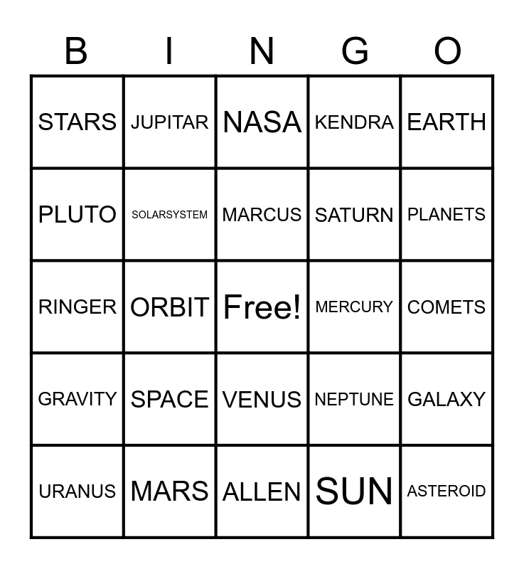 This bingo card has a free space and 24 words: SPACE, MARS, MARCUS, URANUS, EARTH, STARS, PLUTO, JUPITAR, MERCURY, VENUS, SATURN, RINGER, NEPTUNE, GALAXY, SOLARSYSTEM, SUN, COMETS, NASA, PLANETS, ORBIT, ASTEROID, GRAVITY, KENDRA and ALLEN.