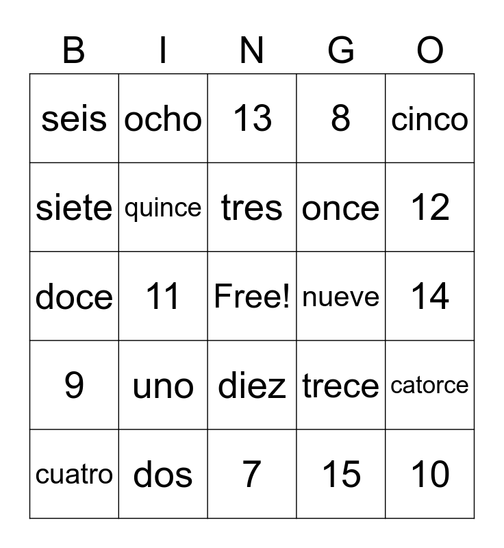 This bingo card has a free space and 24 words: uno, dos, tres, cuatro, cinco, seis, siete, ocho, nueve, diez, once, doce, trece, catorce, quince, 15, 14, 13, 12, 11, 10, 9, 8 and 7.