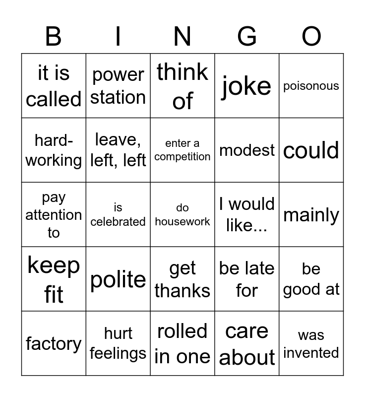 This bingo card has 33 words: was invented, were invented, is celebrated, healthy, keep fit, leave, left, left, poisonous, factory, power station, as well, enter a competition, think of, Where have you been?, Have you ever been...?, I would like..., could, hurt feelings, pay attention to, polite, be late for, get thanks, adults, it is called, mainly, rolled in one, do housework, joke, modest, hard-working, be good at, to enjoy smb's company, care about and bring brought brought.