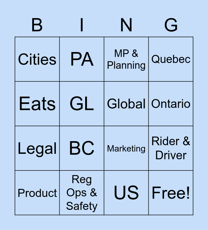 This bingo card has 16 words: Reg Ops & Safety, Rider & Driver, MP & Planning, Cities, Legal, PA, Marketing, US, Eats, GL, Product, Quebec, BC, Ontario, Global and Free!.