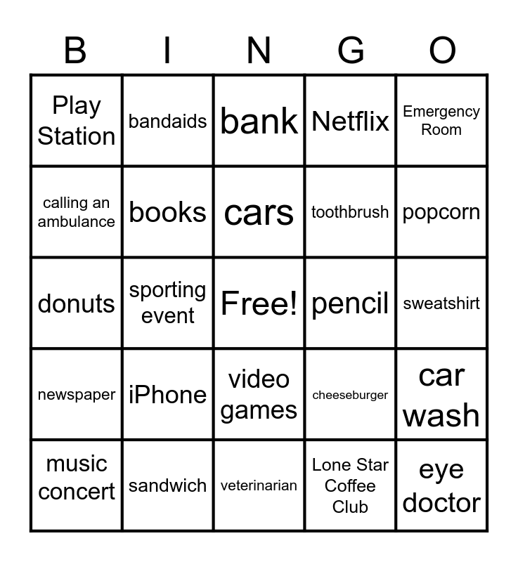 This bingo card has a free space and 29 words: firefighter, sandwich, bank, hot chocolate, Emergency Room, Play Station, books, cars, pencil, car wash, music concert, sporting event, Lone Star Coffee Club, eye doctor, donuts, dentist, veterinarian, cheeseburger, popcorn, newspaper, iPhone, going to the movies, toothbrush, sweatshirt, calling an ambulance, bandaids, video games, Netflix and getting nails done.