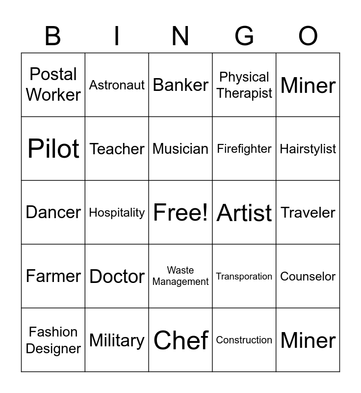 This bingo card has a free space and 24 words: Doctor, Military, Musician, Fashion Designer, Miner, Postal Worker, Pilot, Astronaut, Artist, Waste Management, Firefighter, Dancer, Transporation, Counselor, Teacher, Construction, Traveler, Banker, Hairstylist, Hospitality, Miner, Farmer, Physical Therapist and Chef.