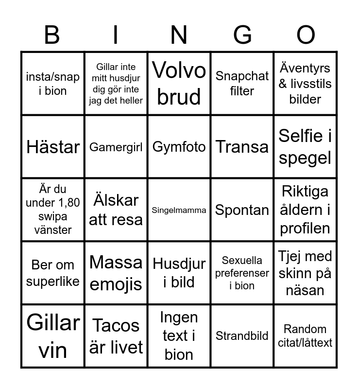 This bingo card has a free space and 24 words: Massa emojis, Tacos är livet, Gymfoto, Gillar vin, Äventyrs & livsstils bilder, insta/snap i bion, Hästar, Gillar inte mitt husdjur dig gör inte jag det heller, Spontan, Husdjur i bild, Transa, Är du under 1,80 swipa vänster, Sexuella preferenser i bion, Tjej med skinn på näsan, Gamergirl, Strandbild, Riktiga åldern i profilen, Volvo brud, Selfie i spegel, Älskar att resa, Random citat/låttext, Ber om superlike, Snapchat filter and Ingen text i bion.
