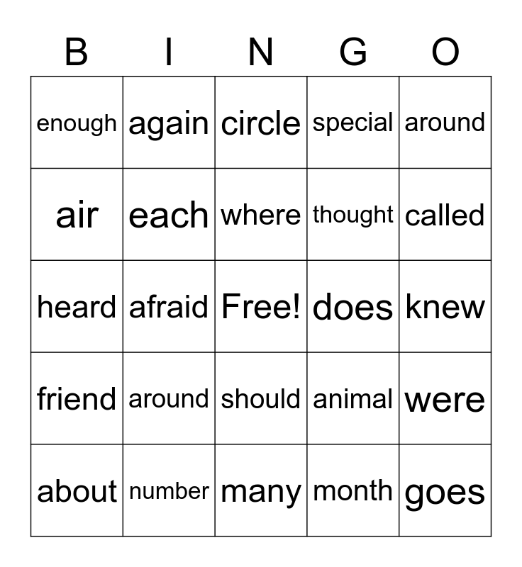 This bingo card has a free space and 29 words: about, could, afraid, before, enough, circle, each, around, does, number, knew, goes, many, month, called, because, should, friend, around, heard, animal, choose, thought, air, special, again, were, where and every.