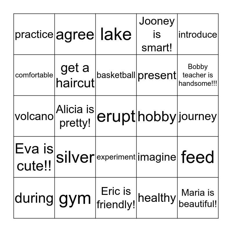This bingo card has a free space and 24 words: silver, gym, basketball, during, introduce, practice, comfortable, agree, hobby, experiment, present, volcano, imagine, feed, get a haircut, healthy, journey, lake, Bobby teacher is handsome!!!, Alicia is pretty!, Maria is beautiful!, Eva is cute!!, Jooney is smart! and Eric is friendly!.