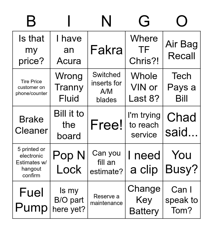 This bingo card has a free space and 24 words: Pop N Lock, Is my B/O part here yet?, Switched inserts for A/M blades, Fuel Pump, Air Bag Recall, Is that my price?, Tire Price customer on phone/counter, I have an Acura, I'm trying to reach service, Can you fill an estimate?, Whole VIN or Last 8?, Brake Cleaner, I need a clip, You Busy?, Wrong Tranny Fluid, Change Key Battery, Chad said..., Fakra, Tech Pays a Bill, Bill it to the board, Can I speak to Tom?, 5 printed or electronic Estimates w/ hangout confirm, Where TF Chris?! and Reserve a maintenance.