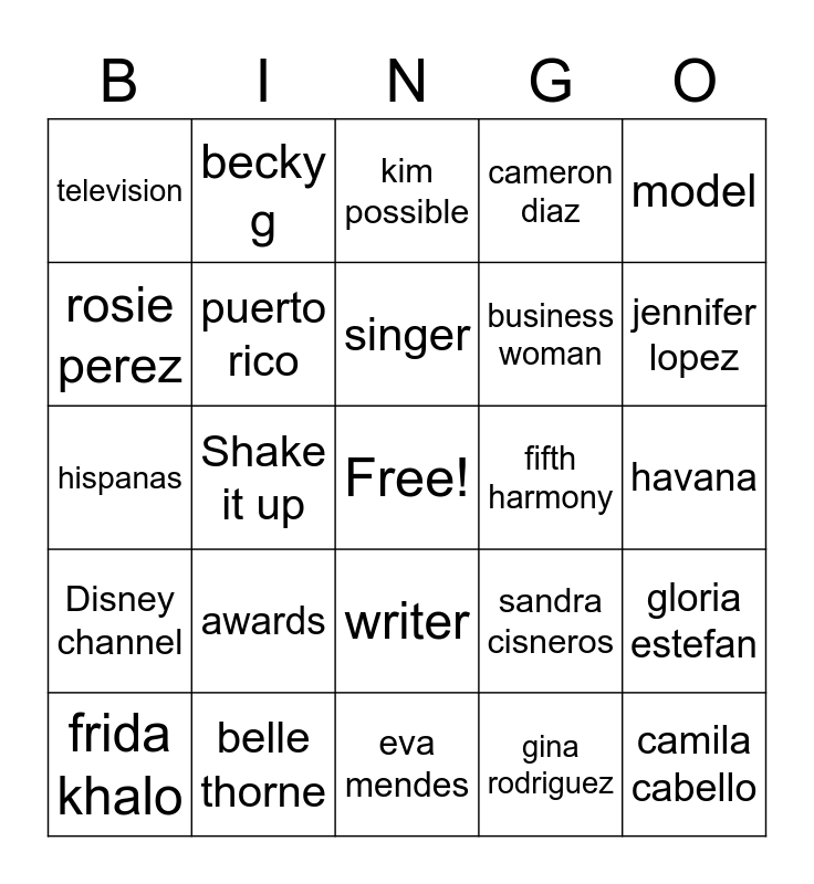 This bingo card has a free space and 41 words: mujeres, hispanas, cuba, puerto rico, belle thorne, writer, singer, actress, model, Disney channel, Shake it up, cameron diaz, camila cabello, havana, fifth harmony, awards, judge millian, television, christina millian, kim possible, gloria estefan, the congo, eva mendes, business woman, music videos, latinas, gina rodriguez, rita moreno, jennifer lopez, sonia sotomayor, alexandria ocasio cortez, becky g, frida khalo, dolores huerta, sandra cisneros, rosie perez, ellen ochoa, jenna ortega, jessica alba, selena and Mexico.
