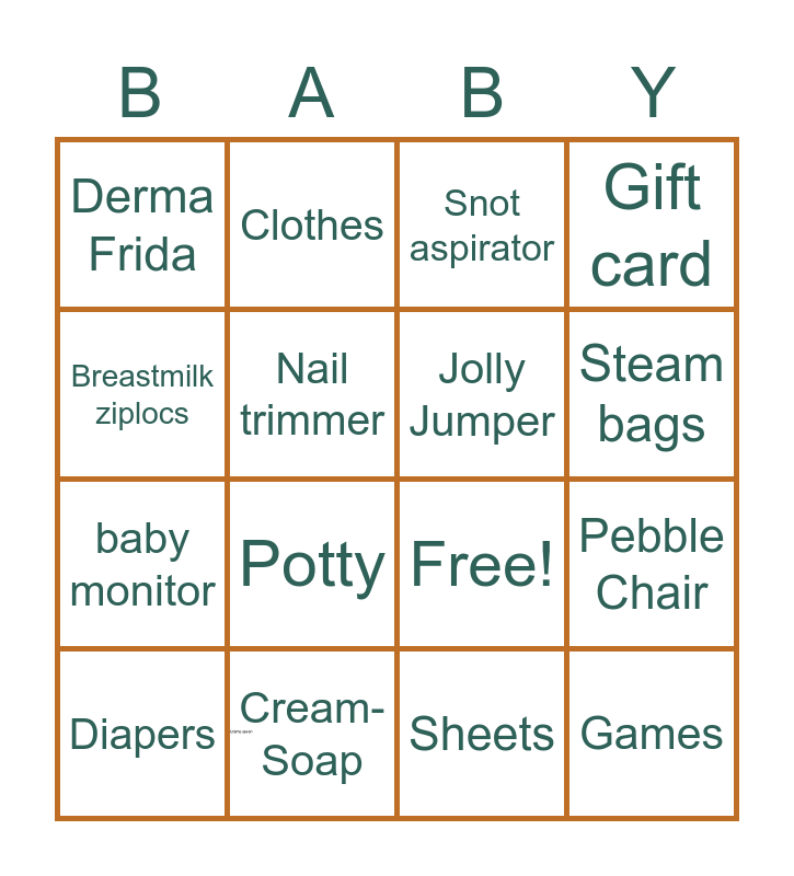 This bingo card has 2 images and 22 words: Cream-Soap, Books, Clothes, Milk pump, Nail trimmer, Jolly Jumper, Derma Frida, Snot aspirator, Free!, Games, baby monitor, Gift card, Stroller accessories, Swaddle, Sheets, Milk formula container, Pebble Chair, Diapers, Potty, Breastmilk ziplocs, Steam bags and Ring sling.