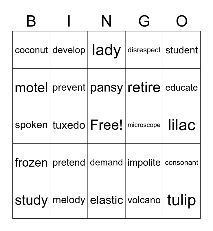 This bingo card has a free space and 24 words: pretend, melody, pansy, study, student, coconut, motel, develop, microscope, demand, retire, spoken, impolite, consonant, prevent, volcano, lilac, lady, educate, tuxedo, tulip, frozen, disrespect and elastic.