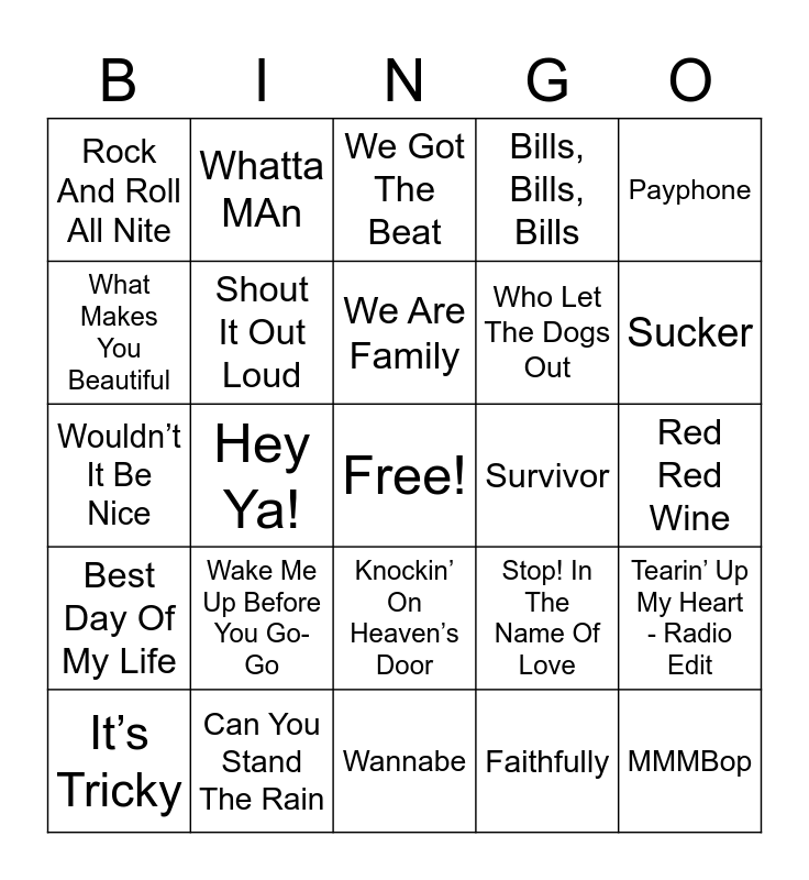 This bingo card has a free space and 68 words: You Get What You Give, MMMBop, Spice Up Your Life, C’est La Vie, Who’s Loving You, Boogie Wonderland, Whatta MAn, Vacation, We Are Family, Blame It On the Boogie, Knockin’ On Heaven’s Door, Poison, Red Red Wine, Payphone, Get Down On It, What Makes You Beautiful, Hey Ya!, Rock And Roll All Nite, EveryBody ( Backstreet’s Back ), Wake Me Up Before You Go-Go, Who Let The Dogs Out, Stop! In The Name Of Love, Best Day Of My Life, December, 1963 ( Oh What A Night), Build Me Up Buttercup, Land Of A Thousand Dances, No Scrub, Water Falls, Tearin’ Up My Heart - Radio Edit, Landslide, We Got The Beat, Walk Like an Egyptian, Little Bitty Pretty One, Every Breath You Take, Bills, Bills, Bills, Don't Stop Me Now, I'm A Believer, It’s Tricky, Sucker, Wouldn’t It Be Nice, Any Way You Want it, Stayin Alive, Shout It Out Loud, Love Grows ( Where My Rosemary Goes), Let’s Groove, More Than A Woman, ABC, Karma Chameleon, Survivor, Can You Stand The Rain, What A Man Gotta Do, I'm So Excited, Chapel Of Love, Wannabe, Glad You Came, Step By Step, Faithfully, Y.M.C.A, I Want You Back, I’m Gonna Be (500 Miles), Cruel Summer, My Lovin’ (You’re Never Gonna Get It ), Don’t You ( Forget About Me), Stayc’s Mom, Take on Me, Counting Stars, All Star and I Want It That Way.