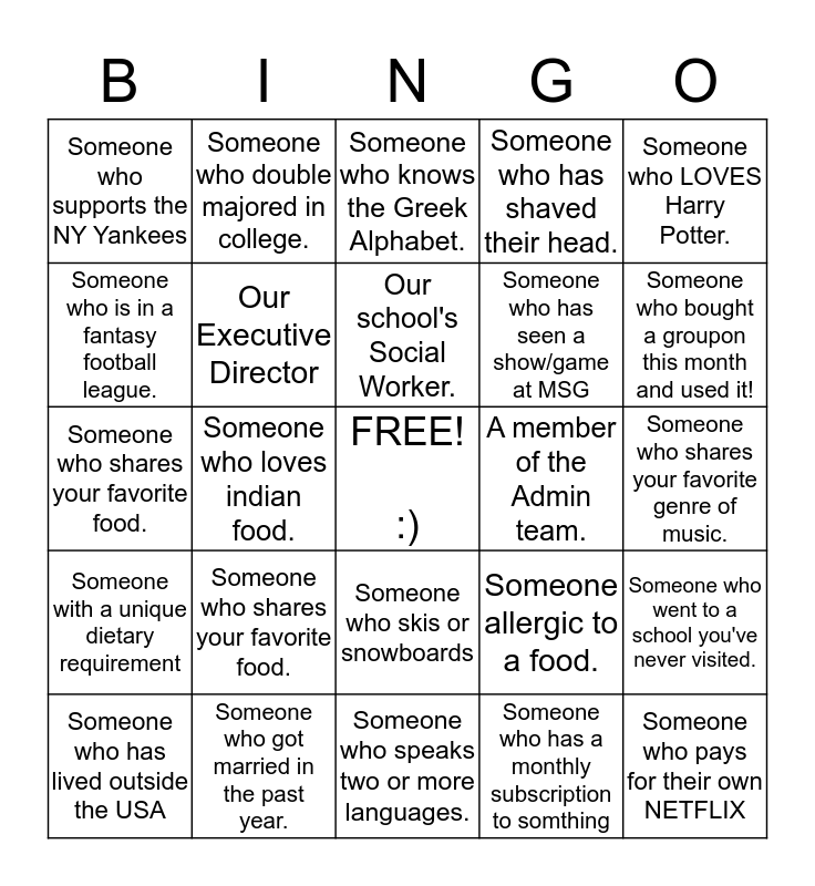 This bingo card has a free space and 24 words: Someone who shares your favorite food., Someone who got married in the past year., Our school's Social Worker., Someone who has lived outside the USA, Someone who LOVES Harry Potter., Someone who supports the NY Yankees, Someone who is in a fantasy football league., Someone who double majored in college., A member of the Admin team., Someone who skis or snowboards, Someone who has seen a show/game at MSG, Someone who shares your favorite food., Someone allergic to a food., Someone who went to a school you've never visited., Our Executive Director, Someone who has a monthly subscription to somthing, Someone who shares your favorite genre of music., Someone who knows the Greek Alphabet., Someone who bought a groupon this month and used it!, Someone who loves indian food., Someone who pays for their own NETFLIX, Someone with a unique dietary requirement, Someone who has shaved their head. and Someone who speaks two or more languages..
