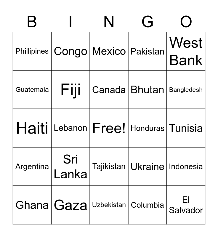 This bingo card has a free space and 33 words: Uganda, Cabo Verde, Lebanon, Bosnia, Argentina, Fiji, West Bank, Ghana, Congo, Republic of Korea, Canada, Mexico, Taiwan, Brazil, Honduras, Bangledesh, Gaza, Haiti, Sri Lanka, Ukraine, Tajikistan, Nigeria, Phillipines, Tunisia, Uzbekistan, El Salvador, Pakistan, Bhutan, Guatemala, Indonesia, Vietnam, Columbia and Kenya.
