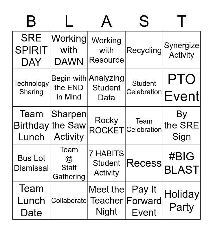 This bingo card has a free space and 24 words: Team @ Staff Gathering, Collaborate, Analyzing Student Data, Team Lunch Date, Synergize Activity, SRE SPIRIT DAY, Technology Sharing, Working with DAWN, Team Celebration, 7 HABITS Student Activity, Student Celebration, Team Birthday Lunch, Recess, #BIG BLAST, Begin with the END in Mind, Pay It Forward Event, By the SRE Sign, Working with Resource, PTO Event, Sharpen the Saw Activity, Holiday Party, Bus Lot Dismissal, Recycling and Meet the Teacher Night.