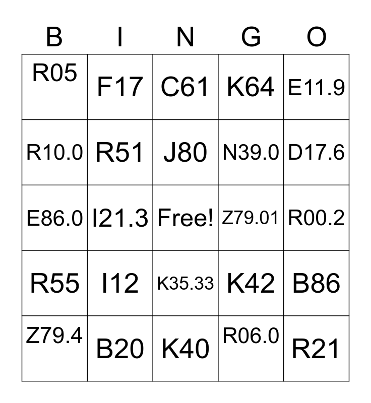 This bingo card has a free space and 29 words: I10, B20, C61, E10.9, E11.9, R05, R51, J80, Z79.01, B86, Z79.4, I21.3, R06.0, R21, E86.0, I11, K40, K42, D17.6, R55, I12, I51.7, N39.0, R00.2, R10.0, F17, K35.33, K64 and U00.