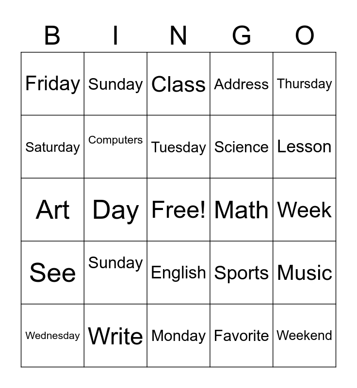 This bingo card has a free space and 25 words: Sunday, Monday, Tuesday, Wednesday, Thursday, Friday, Saturday, Sunday, Math, English, Science, Art, Sports, Music, Computers, Learn, Week, Class, Lesson, Day, Weekend, Write, See, Address and Favorite.