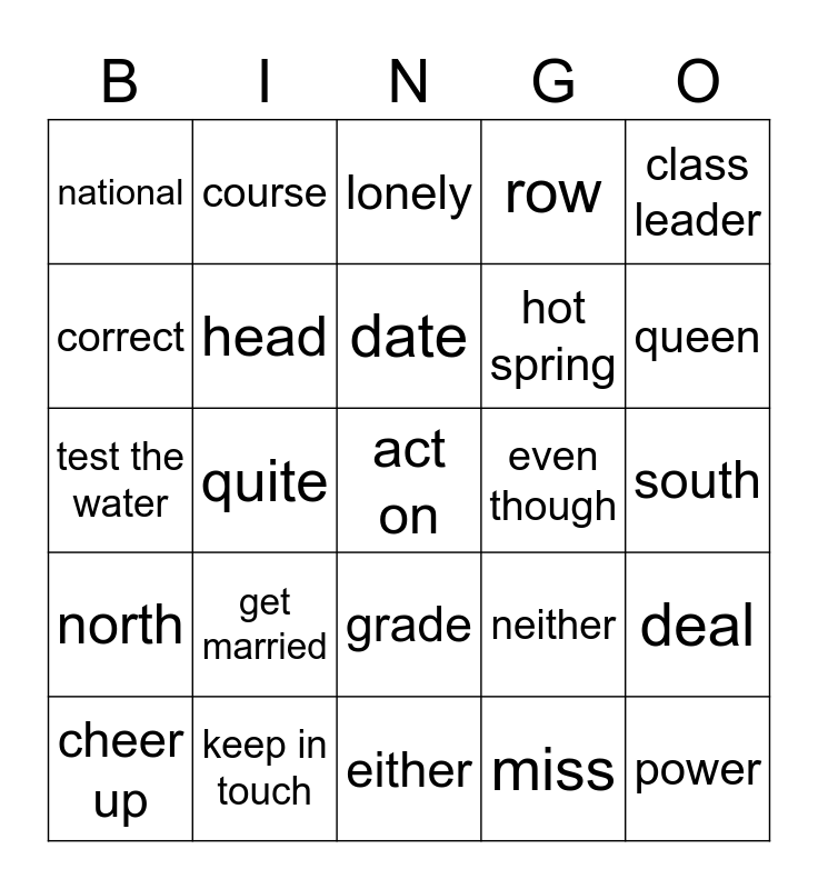 This bingo card has a free space and 24 words: get married, keep in touch, date, cheer up, class leader, national, correct, course, even though, grade, hot spring, test the water, neither, deal, head, miss, south, lonely, queen, quite, power, north, row and either.