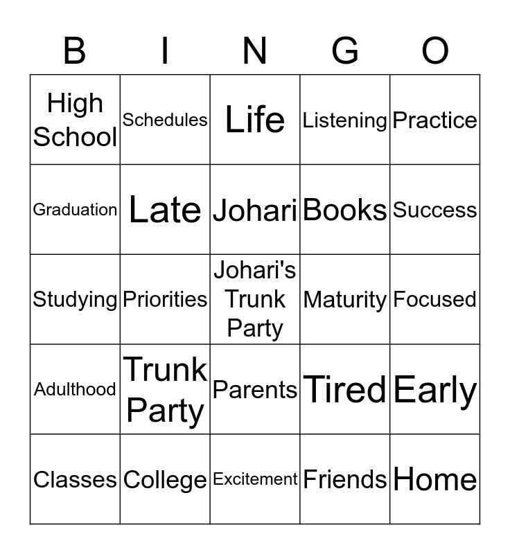 This bingo card has a free space and 24 words: Trunk Party, College, Johari, Classes, Practice, High School, Graduation, Schedules, Maturity, Parents, Books, Studying, Tired, Early, Late, Friends, Focused, Life, Success, Priorities, Home, Adulthood, Listening and Excitement.