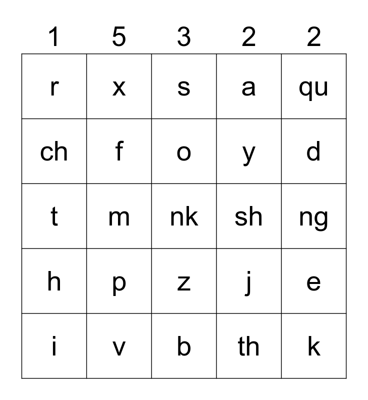 This bingo card has 30 words: v, l, m, n, r, s, f, z, sh, b, ng, nk, th, k, d, g, j, h, p, qu, t, w, x, y, ch, a, e, i, o and u.