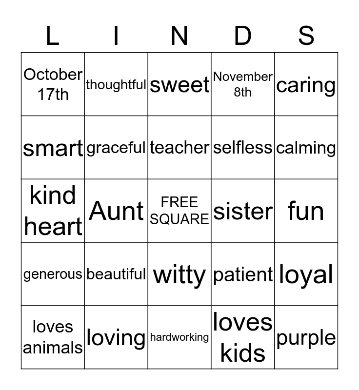 This bingo card has a free space and 24 words: beautiful, loving, teacher, loves animals, caring, October 17th, smart, thoughtful, sister, witty, selfless, kind heart, patient, loyal, graceful, loves kids, fun, sweet, calming, Aunt, purple, generous, November 8th and hardworking.