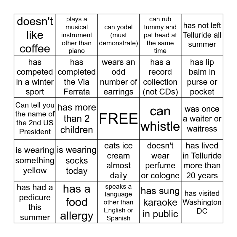 This bingo card has a free space and 24 words: is wearing socks today, has a food allergy, wears an odd number of earrings, has had a pedicure this summer, has not left Telluride all summer, doesn't like coffee, has competed in a winter sport, plays a musical instrument other than piano, can whistle, eats ice cream almost daily, has a record collection (not CDs), Can tell you the name of the 2nd US President, doesn't wear perfume or cologne, has lived in Telluride more than 20 years, has completed the Via Ferrata, has sung karaoke in public, was once a waiter or waitress, can yodel (must demonstrate), has lip balm in purse or pocket, has more than 2 children, has visited Washington DC, is wearing something yellow, can rub tummy and pat head at the same time and speaks a language other than English or Spanish.