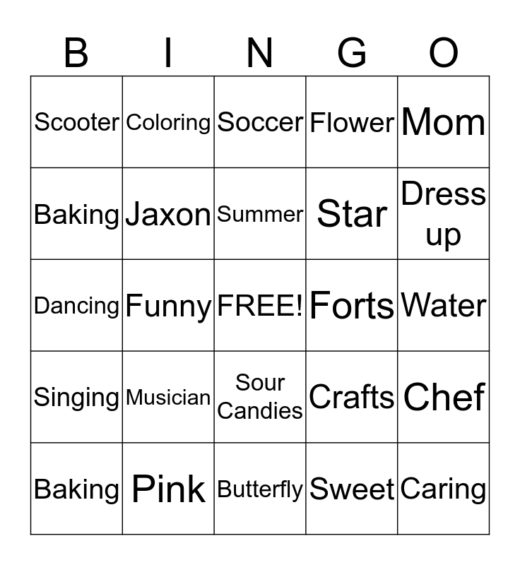 This bingo card has a free space and 42 words: Sugar, Summer, Bike Ride, Musician, Sweet, Chef, Caring, Grandma, Soccer, Sour Candies, Water, Dress up, Funny, Mom, Paisley, Crafts, Doctor, Dancing, 4 Wheeler, Coloring, Baking, Potions, Chocolate, Scooter, Jewelry, Drawing, Star, Daddy, Kenzie, Birthday, Harley Quinn, Singing, Jaxon, Butterfly, Beautiful, Baking, Pink, Forts, Swimming, Mommy, Flower and Batman.