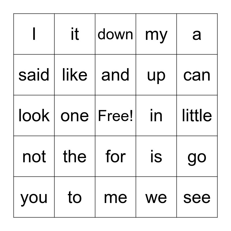 This bingo card has a free space and 24 words: the, to, and, you, a, I, said, it, in, for, up, look, is, go, like, we, little, down, can, one, see, not, my and me.
