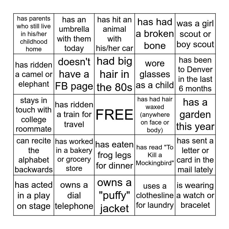 This bingo card has a free space and 24 words: has worked in a bakery or grocery store, owns a dial telephone, had big hair in the 80s, has acted in a play on stage, was a girl scout or boy scout, has parents who still live in his/her childhood home, has ridden a camel or elephant, has an umbrella with them today, has had hair waxed (anywhere on face or body), has eaten frog legs for dinner, wore glasses as a child, stays in touch with college roommate, has read "To Kill a Mockingbird", has sent a letter or card in the mail lately, doesn't have a FB page, uses a clothesline for laundry, has a garden this year, has hit an animal with his/her car, has been to Denver in the last 6 months, has ridden a train for travel, is wearing a watch or bracelet, can recite the alphabet backwards, has had a broken bone and owns a "puffy" jacket.