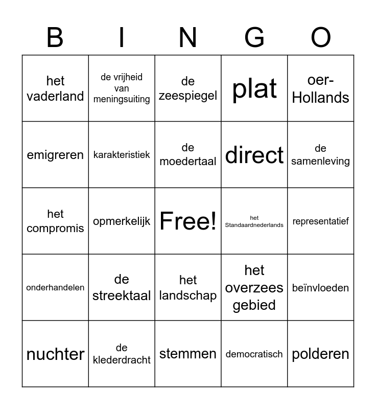 This bingo card has a free space and 40 words: chauvinistisch, het compromis, inpolderen, karakteristiek, de klederdracht, het landschap, de moedertaal, nostalgisch, oer-Hollands, onderhandelen, opmerkelijk, plat, polderen, representatief, het Standaardnederlands, de streektaal, typisch, het vaderland, de waterwerken, de zeespiegel, beïnvloeden, democratisch, direct, emigreren, exporteren, de godsdienstvrijheid, handel drijven, immigreren, de kolonie, de levensovertuiging, de normen en waarden, nuchter, ongeacht, het overzees gebied, de samenleving, stemmen, tolerant, voormalig, de vrijheid van meningsuiting and wereldwijd.