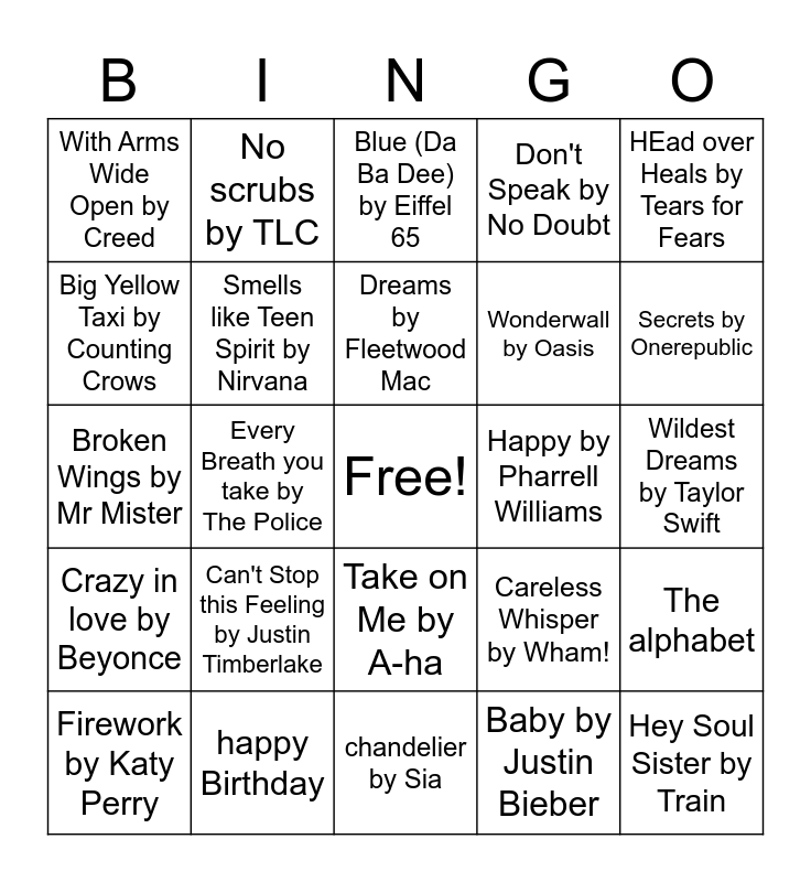 This bingo card has a free space and 29 words: Firework by Katy Perry, Heat waves by Glass Animals, Every Breath you take by The Police, Ring of Fire by Johnny Cash, With Arms Wide Open by Creed, Blue (Da Ba Dee) by Eiffel 65, Smells like Teen Spirit by Nirvana, Can't Stop this Feeling by Justin Timberlake, Happy by Pharrell Williams, happy Birthday, Wildest Dreams by Taylor Swift, Hey Soul Sister by Train, chandelier by Sia, Baby by Justin Bieber, Secrets by Onerepublic, Mary Had a little lamb, Take on Me by A-ha, Crazy in love by Beyonce, HEad over Heals by Tears for Fears, Broken Wings by Mr Mister, Careless Whisper by Wham!, jingle bells, Wonderwall by Oasis, Big Yellow Taxi by Counting Crows, Don't Speak by No Doubt, No scrubs by TLC, The alphabet, Dreams by Fleetwood Mac and London Bridge is Falling Down.