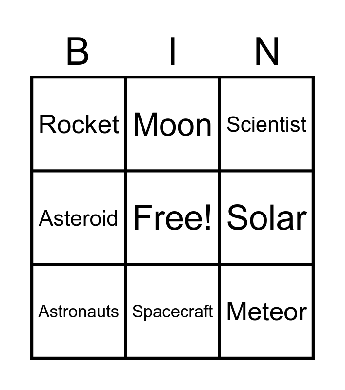 This bingo card has a free space and 14 words: Space, Exploration, Astronauts, Moon, Asteroid, Meteor, Planet, Sun, Spacecraft, Rocket, Star, Solar, Scientist and Astronomy.
