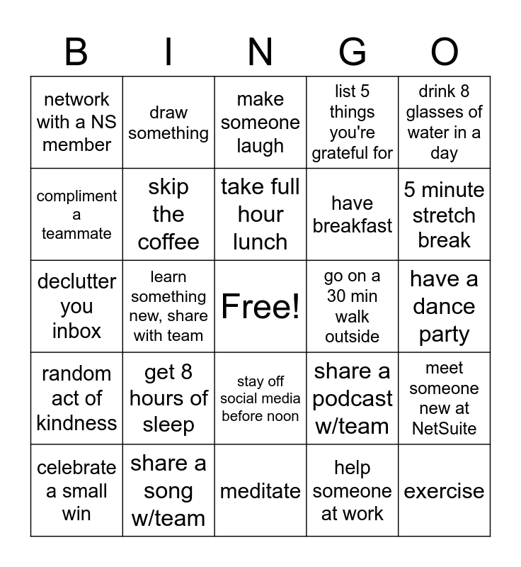 This bingo card has a free space and 24 words: get 8 hours of sleep, share a song w/team, take full hour lunch, celebrate a small win, drink 8 glasses of water in a day, network with a NS member, compliment a teammate, draw something, go on a 30 min walk outside, stay off social media before noon, have breakfast, declutter you inbox, share a podcast w/team, meet someone new at NetSuite, skip the coffee, help someone at work, have a dance party, make someone laugh, 5 minute stretch break, learn something new, share with team, exercise, random act of kindness, list 5 things you're grateful for and meditate.