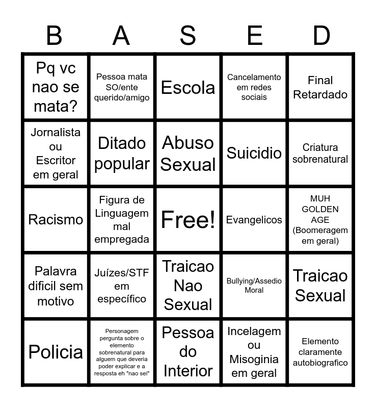 This bingo card has a free space and 24 words: Juízes/STF em específico, Personagem pergunta sobre o elemento sobrenatural para alguem que deveria poder explicar e a resposta eh "nao sei", Abuso Sexual, Policia, Final Retardado, Pq vc nao se mata?, Jornalista ou Escritor em geral, Pessoa mata SO/ente querido/amigo, Evangelicos, Traicao Nao Sexual, Suicidio, Racismo, Bullying/Assedio Moral, Traicao Sexual, Ditado popular, Incelagem ou Misoginia em geral, MUH GOLDEN AGE (Boomeragem em geral), Escola, Criatura sobrenatural, Figura de Linguagem mal empregada, Elemento claramente autobiografico, Palavra dificil sem motivo, Cancelamento em redes sociais and Pessoa do Interior.