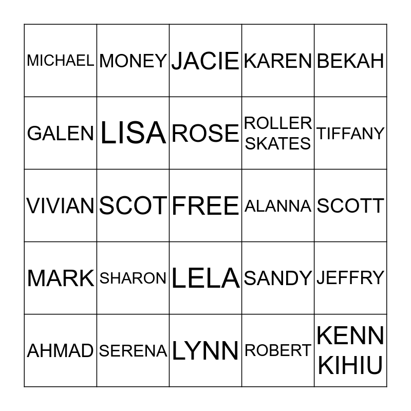 This bingo card has a free space and 24 words: SHARON, SERENA, ROSE, AHMAD, BEKAH, MICHAEL, GALEN, MONEY, ALANNA, LELA, ROLLER SKATES, VIVIAN, SANDY, JEFFRY, LISA, ROBERT, SCOTT, JACIE, TIFFANY, SCOT, KENN KIHIU, MARK, KAREN and LYNN.