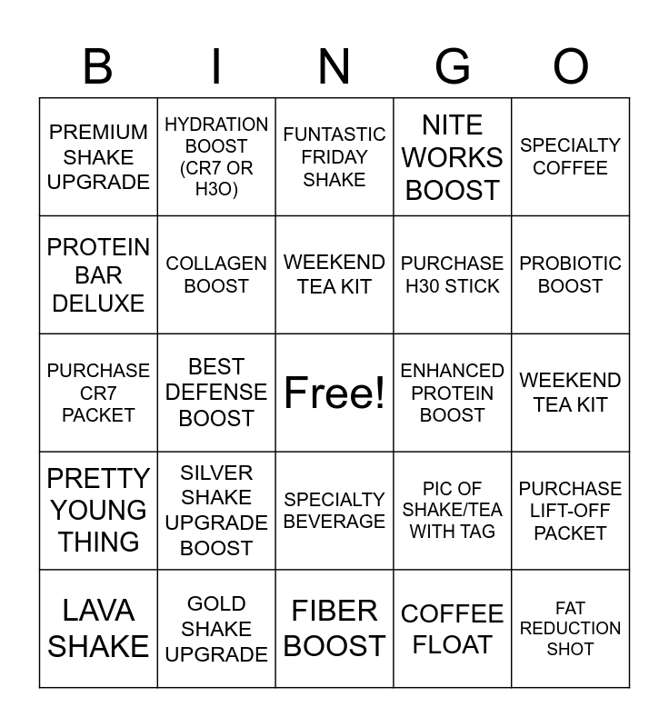 This bingo card has a free space and 26 words: SPECIALTY BEVERAGE, COFFEE FLOAT, WEEKEND TEA KIT, GOLD SHAKE UPGRADE, SPECIALTY COFFEE, PREMIUM SHAKE UPGRADE, PROTEIN BAR DELUXE, HYDRATION BOOST (CR7 OR H3O), WEEKEND TEA KIT, PIC OF SHAKE/TEA WITH TAG, PURCHASE H30 STICK, PURCHASE CR7 PACKET, PURCHASE LIFT-OFF PACKET, LAVA SHAKE, BEST DEFENSE BOOST, IMMUNITY ESSENTIALS BOOST, NITE WORKS BOOST, PRETTY YOUNG THING, FUNTASTIC FRIDAY SHAKE, FAT REDUCTION SHOT, PROBIOTIC BOOST, FIBER BOOST, ENHANCED PROTEIN BOOST, SILVER SHAKE UPGRADE BOOST, COLLAGEN BOOST and BEVERAGE MIX BOOST.