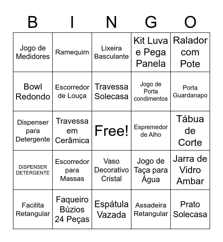 This bingo card has a free space and 74 words: Chaleira Aço Inox, Pincel de Silicone, Lixeira Basculante, Pegador de Salada, Panela de Pressão, Lixeira com Pedal, Prato de Bolo, Prato Oval, Facilita Retangular, Facilita Redonda, Concha Tramontina, Colher de Arroz, Travessa Solecasa, Bowl Redondo, Escova para Sanitario, Travessa em Cerâmica, Prato Retangular de Cristal, Porta Guardanapo, Escorredor de Arroz, Dispenser para Detergente, Escorredor de Louça, Ramequim, Kit Luva e Pega Panela, Assadeira Retangular, Prato Solecasa, Porta Shoyu, Pote com Tampa Dinasty, Batedor Manual, Abridor de Cozinha, Conjunto de 3 Peneiras, Ralador com Pote, Jogo de Facas 9 Peças, Manteigueira de Cristal, Bowl Angel, Frigideira Pintadinha, Assadeira Retangular, Jarra de Vidro, Travessa Retangular, Espátula de Silicone, Ralador com Pote, Espátula Vazada, Faqueiro Búzios 24 Peças, Assadeira Oval Opaline, Assadeira Lasanheira Retangular, Work com Tampa Garlic, Jogo de Medidores, Jogo de Cortadores para Pizza, Escorredor para Massas, Pote Quadrado Dynasty, Concha Class, Colher para Arroz 32cm, Colher para Massas, Tábua de Corte, Organizador com Cesto, Assadeira Redonda com Fundo Removível, Pegador de Gelo Tramontina, Vaso Decorativo Cristal, Prato de Servir Lyor, Batedor de Ovos, Jarra de Vidro Ambar, Jogo de Porta condimentos, Jogo de Utensílios para Cozinha, DISPENSER DETERGENTE, Colher de Sorvete, Espremedor de Alho, Lasanheira 5,3 litros, Garrafa Térmica, Pegador Para Massas, Jogo de Taça para Água, Varal de Chão, Conjunto para, Escorredor de Louças, Cortador de Pizza Inox and Facilita Vap Marinex.