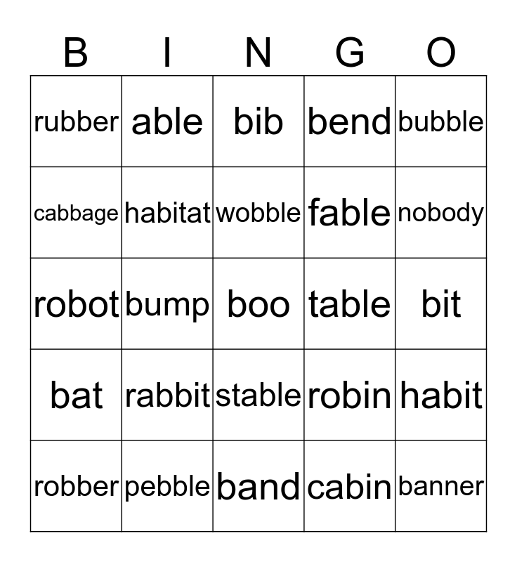 This bingo card has a free space and 24 words: rabbit, pebble, wobble, robber, bubble, rubber, cabbage, able, table, stable, fable, robot, robin, habit, habitat, cabin, bit, bib, nobody, bump, banner, bat, bend and band.