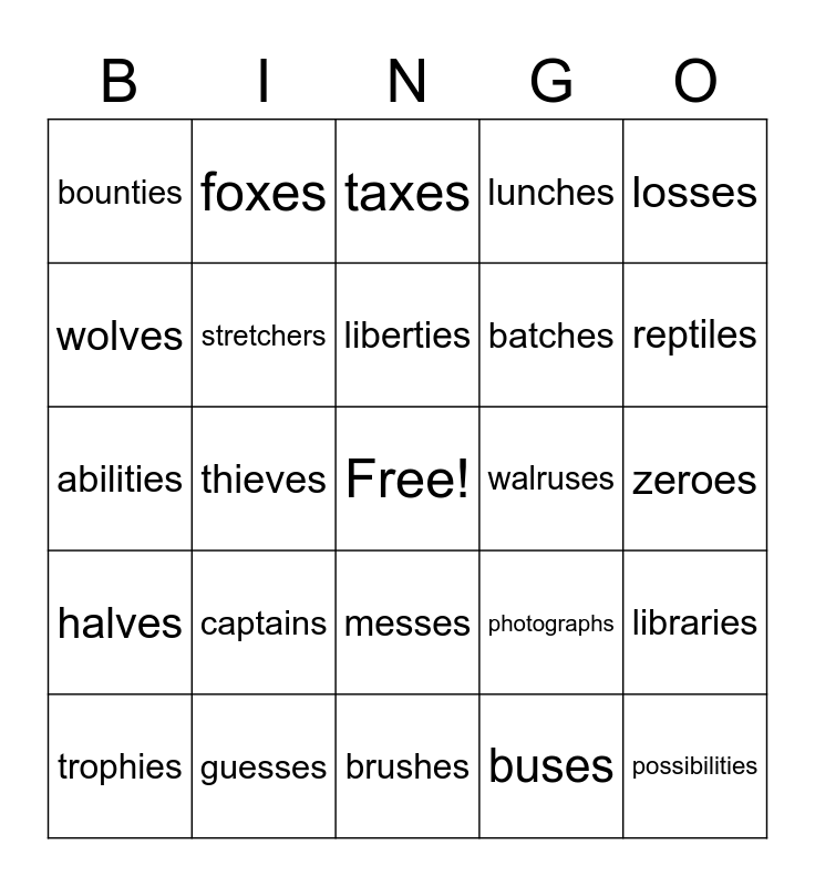 This bingo card has a free space and 24 words: captains, guesses, liberties, trophies, losses, bounties, wolves, foxes, walruses, messes, batches, abilities, photographs, libraries, stretchers, buses, zeroes, taxes, reptiles, thieves, possibilities, halves, lunches and brushes.