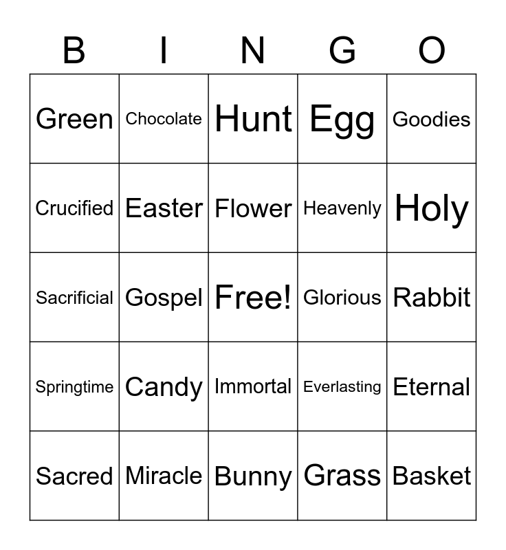 This bingo card has a free space and 50 words: Alive, Basket, Blessed, Bunny, Candy, Christ, Chocolate, Communion, Crucified, Dyed Eggs, Easter, Egg, Eternal, Everlasting, Faithful, Festive, Flower, Glorious, Good Friday, Goodies, Gospel, Grass, Green, Heavenly, Hide, Hip Hop, Holy, Hope, Hunt, Immortal, Inspirational, Joy, Lent, Lily, Miracle, Palm Sunday, Pastel, Peeps, Pray, Rabbit, Religious, Repent, Resurrected, Risen, Sacred, Sacrificial, Spring, Spring forward, Springtime and Tradition.
