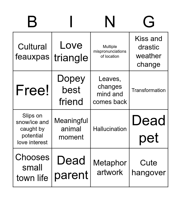 This bingo card has 16 words: Dead parent, Dead pet, Multiple mispronunciations of location, Cultural feauxpas, Slips on snow/ice and caught by potential love interest, Love triangle, Hallucination, Metaphor artwork, Free!, Dopey best friend, Chooses small town life, Kiss and drastic weather change, Meaningful animal moment, Transformation, Leaves, changes mind and comes back and Cute hangover.
