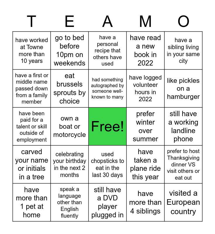 This bingo card has a free space and 24 words: celebrating your birthday in the next 2 months, speak a language other than English fluently, had something autographed by someone well-known to many, have more than 1 pet at home, have a sibling living in your same city, have worked at Towne more than 10 years, have a first or middle name passed down from a family member, go to bed before 10pm on weekends, prefer winter over summer, used chopsticks to eat in the last 30 days, have logged volunteer hours in 2022, have been paid for a talent or skill outside of employment, have taken a plane ride this year, prefer to host Thanksgiving dinner VS visit others or eat out, eat brussels sprouts by choice, have more than 4 siblings, still have a working landline phone, have a personal recipe that others have used, like pickles on a hamburger, own a boat or motorcycle, visited a European country, carved your name or initials in a tree, have read a new book in 2022 and still have a DVD player plugged in.