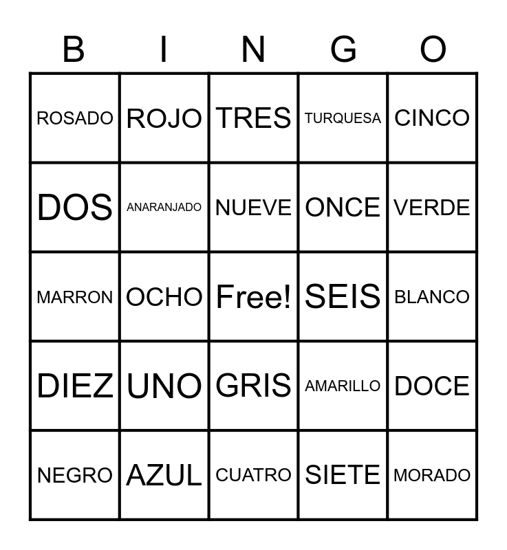 This bingo card has a free space and 24 words: UNO, AZUL, NUEVE, NEGRO, CINCO, ROSADO, DOS, ROJO, SEIS, GRIS, ONCE, MARRON, AMARILLO, DOCE, ANARANJADO, SIETE, BLANCO, TRES, VERDE, OCHO, MORADO, DIEZ, TURQUESA and CUATRO.