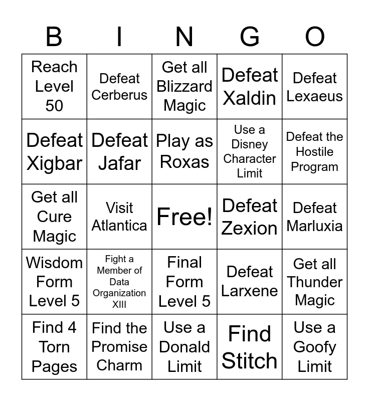 This bingo card has a free space and 54 words: Valor Form Level 5, Wisdom Form Level 5, Limit Form Level 5, Master Form Level 5, Final Form Level 5, Defeat Demyx, Defeat Xaldin, Defeat Roxas, Defeat Xigbar, Defeat Luxord, Reach Level 50, Fully Complete a World, Find the Promise Charm, Find 4 Torn Pages, Use Trinity Limit, Use a Donald Limit, Use a Goofy Limit, Use a Disney Character Limit, Use 2 Different Summons, Defeat Marluxia, Defeat Larxene, Defeat Vexen, Defeat Zexion, Defeat Lexaeus, Fight Pete Twice, Defeat Cerberus, Defeat Barbossa, Defeat Oogie Boogie, Defeat Scar, Find Stitch, Find Genie, Find Peter Pan, Find Chicken Little, Get all Fire Magic, Get all Blizzard Magic, Get all Magnet Magic, Get all Cure Magic, Get all Thunder Magic, Get all Reflect Magic`, Defeat Jafar, Defeat The Experiment, Defeat Hades, Defeat the Groundshaker, Defeat the Grim Reaper, Fight a Member of Data Organization XIII, Find the Proof of Peace, Find the Proof of Connection, Find the Proof of Non-Existence, Play as Roxas, Visit Atlantica, Defeat the Hostile Program, Defeat Sark, Complete a Cup in the Coliseum and Fight Xemnas in a 1v1.